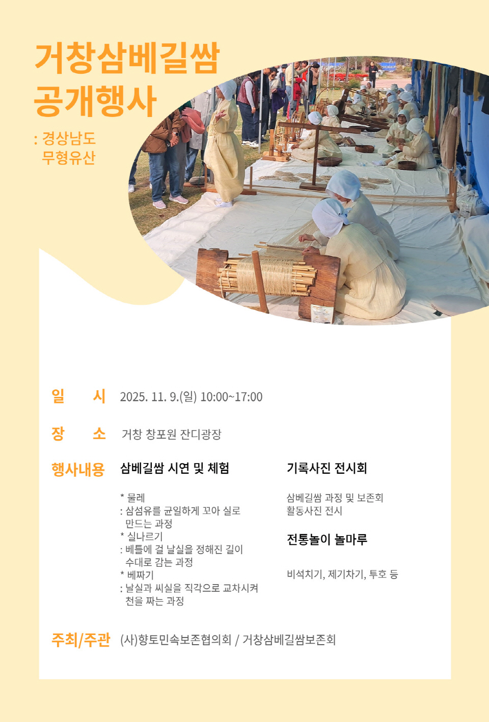 천혜의 풍광과 넉넉한 들판 위에 선 거창은 문화예술의 도시로, 매년 국제연극제를 개최하며 문화 축제를 즐기는 곳으로 이름난 고장입니다.거창군의 『사단법인 향토민속보존협의회』는 2013년부터 지금까지 경상남도 무형유산 삼베길쌈 공개행사를 진행하고 있습니다. 삼베길쌈이란 삼을 재배하여 실을 만들고 베(천)를 짜는 전통 공정을 말합니다. 이번 공개행사는 우리 고유의 전통 의복 문화인 삼베길쌈의 과정을 현장에서 시연합니다. 무형유산 보유자 어르신들의 손끝에서 이어온 길쌈의 과정을 눈앞에서 만나보시고 직접 체험 프로그램에도 참여해 보시기 바랍니다. 본 행사는 거창군민과 학생을 비롯해 거창을 찾아주시는 관광객 모두에게 열려 있습니다. 많은 관심과 참여 바랍니다.◆ 행사개요- 행 사 명 : 도 무형유산 삼베길쌈 공개행사- 일 시 : 2025. 11. 9.(일) 10:00~17:00- 장 소 : 거창 창포원 잔디광장- 주 최 : (사)향토민속보존협의회(이사장 박종섭)- 주 관 : 거창삼베길쌈보존회(회장 이옥수)- 주요내용 : 삼베길쌈 시연 및 체험, 기록사진 전시회 등◆ 행사일정삼베길쌈 시연 및 체험- 물레 : 삼섬유를 균일하게 꼬아 실로 만드는 과정- 실나르기 : 베틀에 걸 날실을 정해진 길이 수대로 감는 과정- 베짜기 : 날실과 씨실을 직각으로 교차시켜 천을 짜는 과정