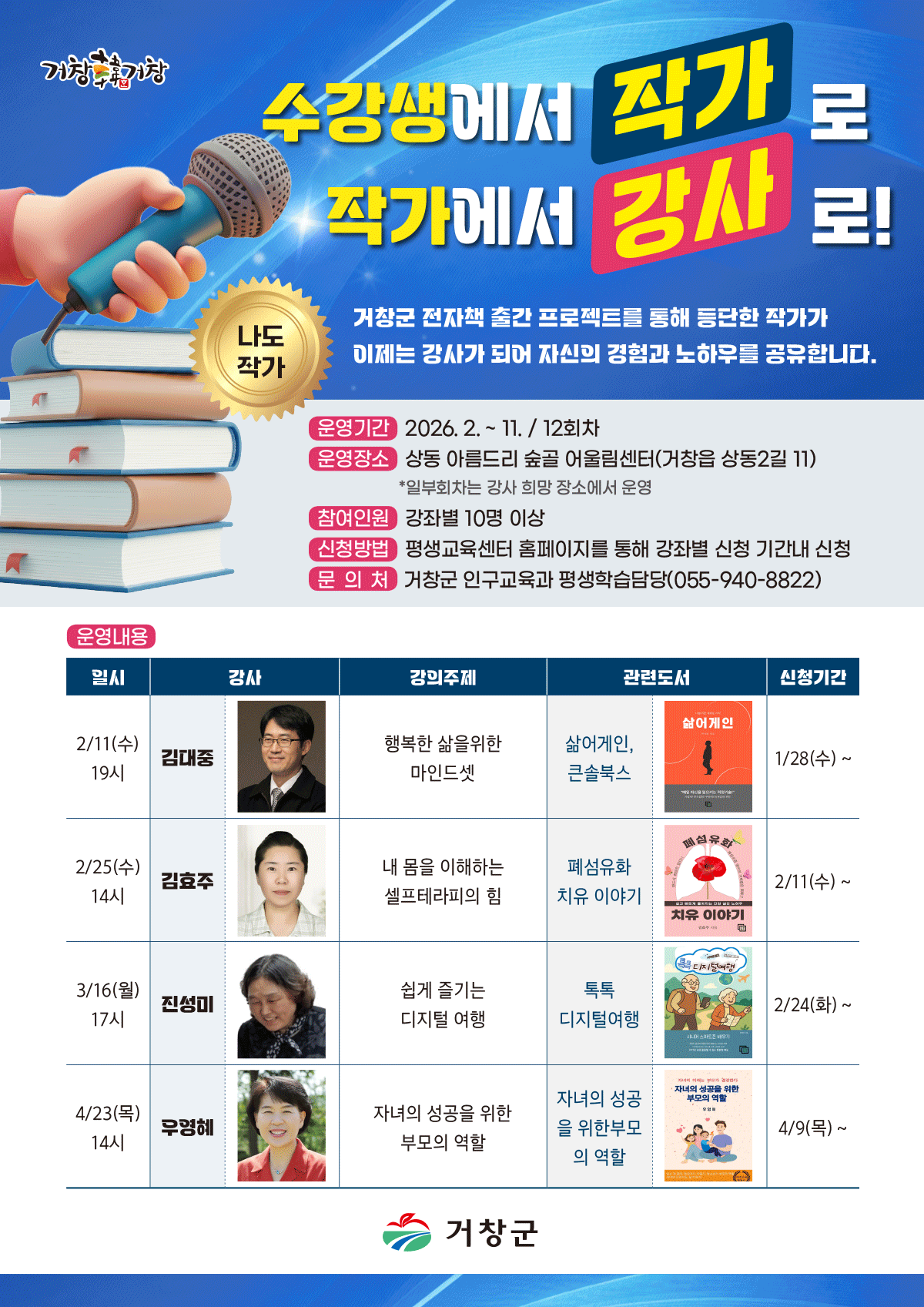 거창군 전자책 출간 프로젝트를 통해 등단한 작가가 이제는 강사가 되어 자신의 경험과 노하우를 공유합니다.