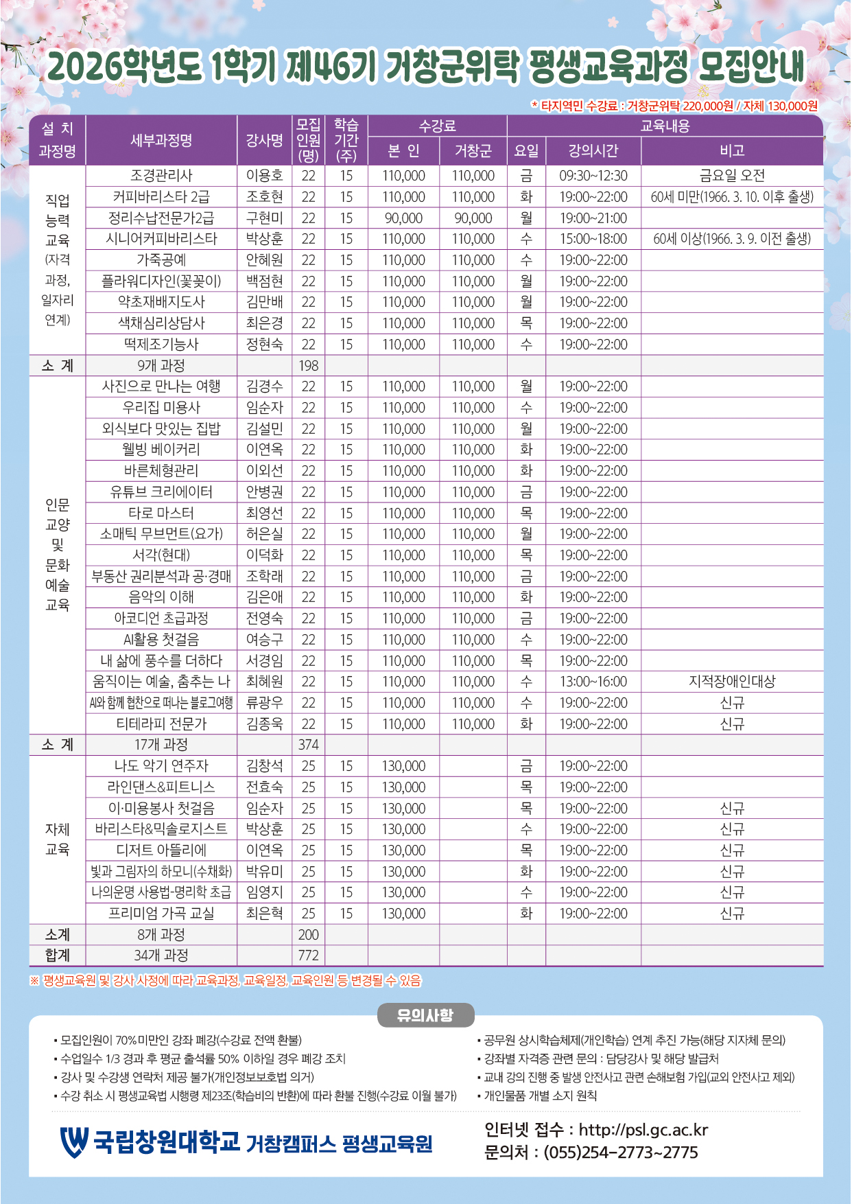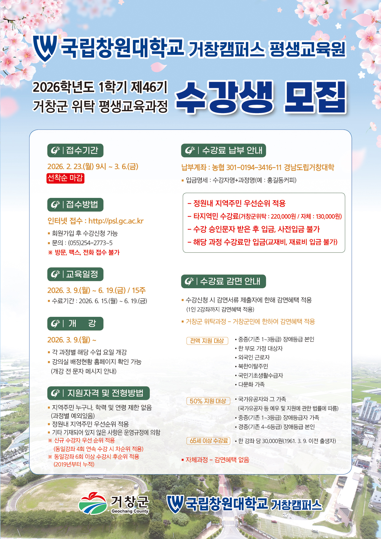 국립창원대학교 거창캠퍼스 평생교육원 2026학년도 1학기 제46기 평생교육과정 수강생 모집