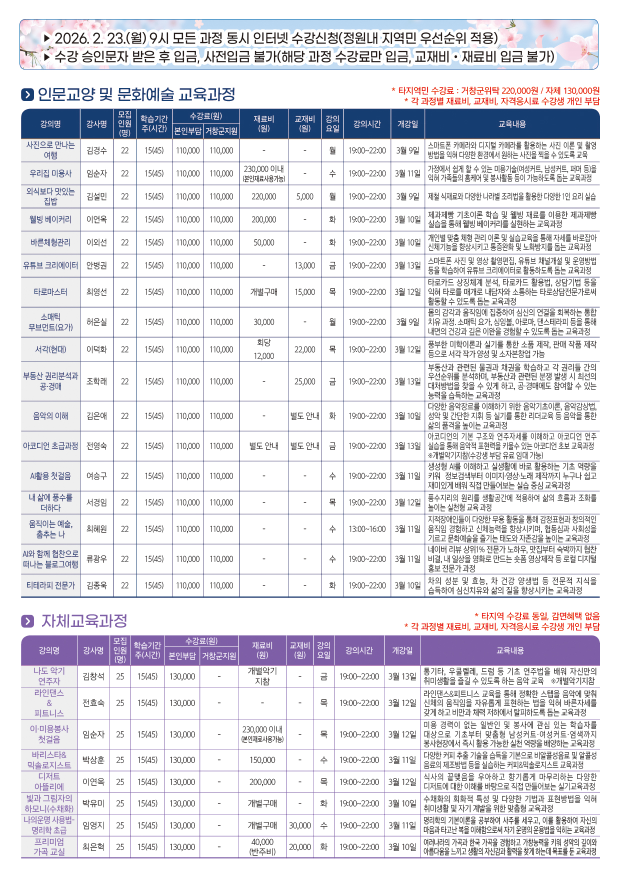 2026학년도 1학기 제46기 평생교육과정 수강생 모집