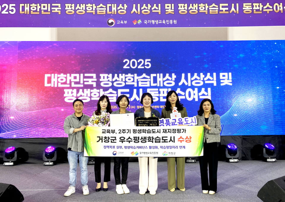 거창군은 지난 10월 1일 정부세종컨벤션센터에서 열린 제22회 대한민국 평생학습대상 시상식과 우수평생학습도시 시상식에서 우수 평생학습도시 선정 기념패를 수상했다고 밝혔다. 이날 행사에는 김현미 거창군 부군수를 거창군은 지난 10월 1일 정부세종컨벤션센터에서 열린 제22회 대한민국 평생학습대상 시상식과 우수평생학습도시 시상식에서 우수 평생학습도시 선정 기념패를 수상했다고 밝혔다. 이날 행사에는 김현미 거창군 부군수를 비롯해 인구교육과장, 평생학습담당 공무원 등 5명이 함