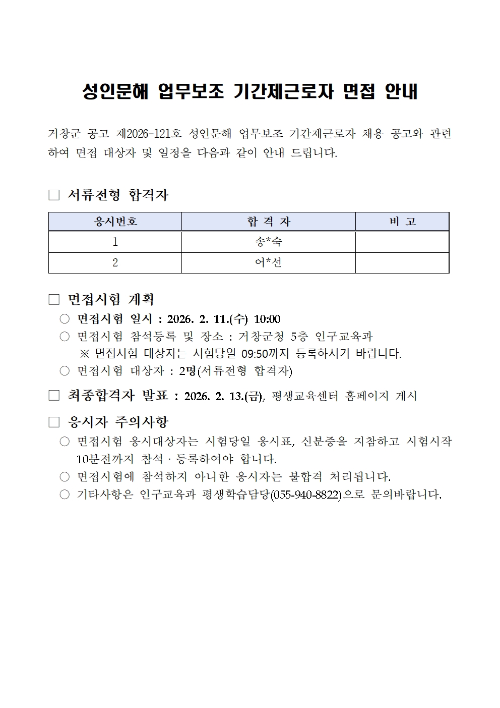 | 성인문해 업무보조 기간제근로자 면접 안내 | |