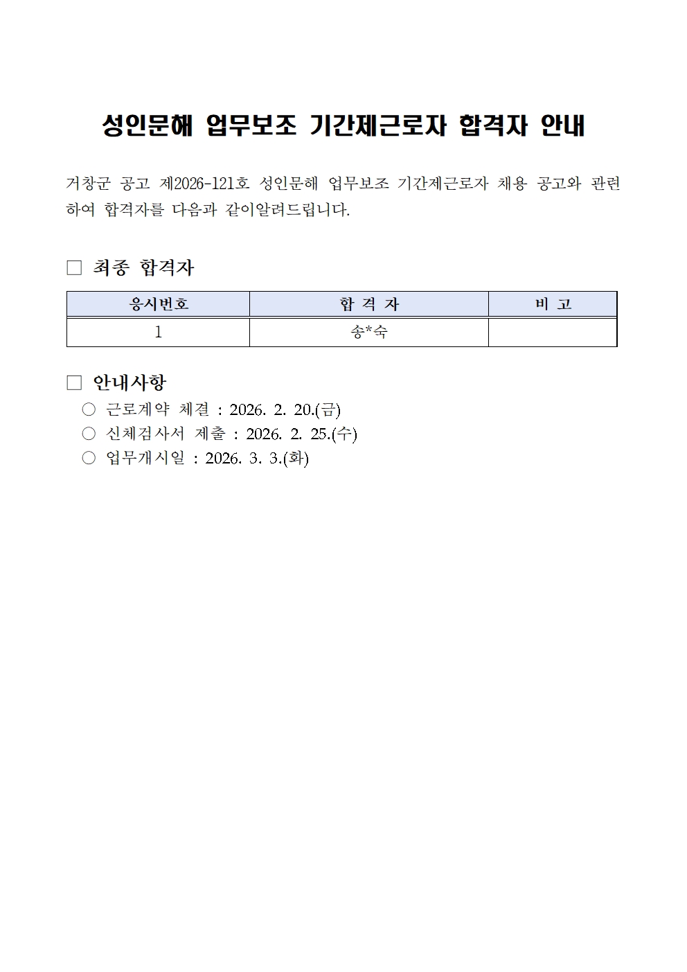 | 362 | 성인문해 업무보조 기간제근로자 합격자 안내 | 거창군평생교육센터 | 2026-02-13 | 90 |