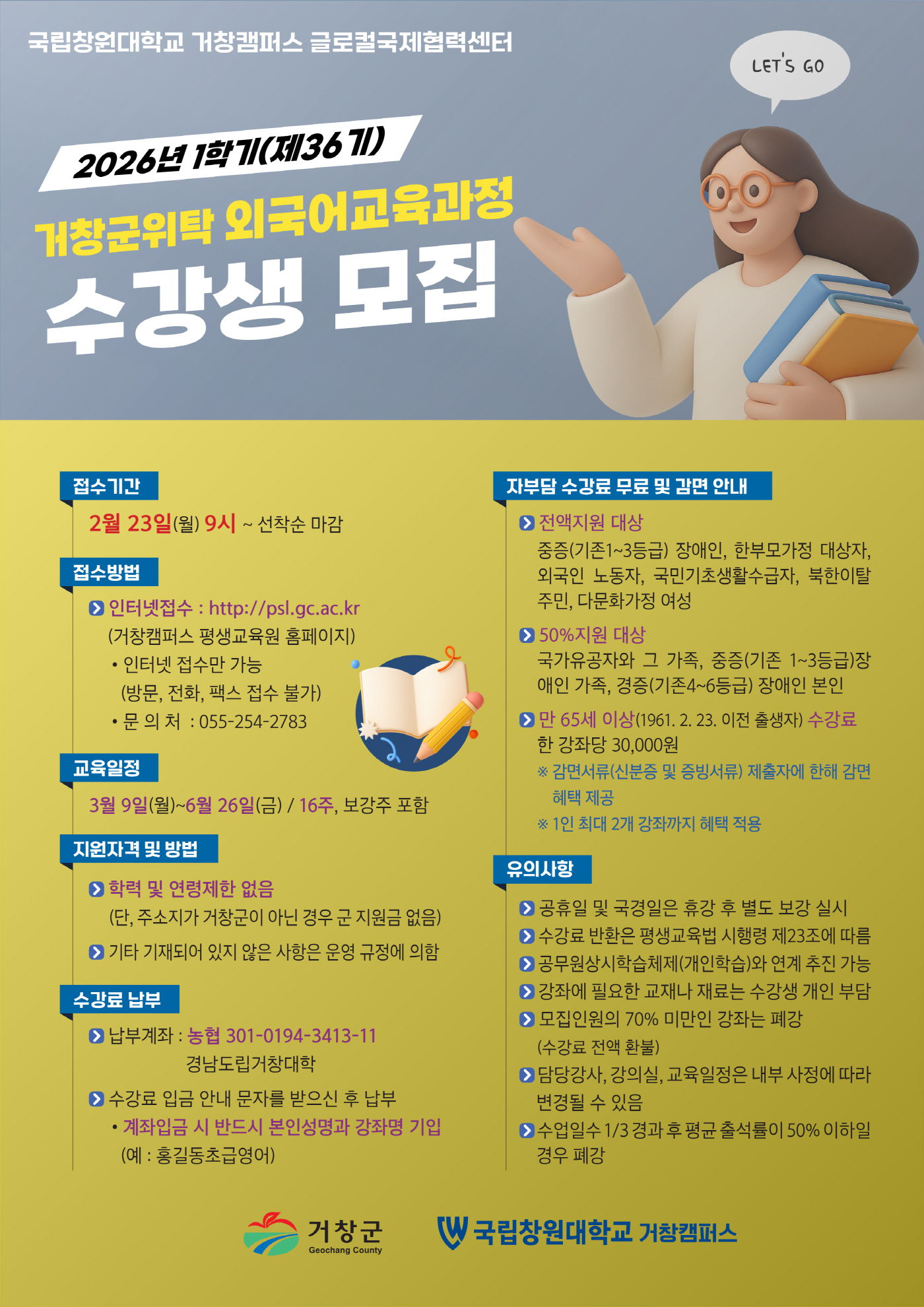 ★ 접수기간 : 2026.2.23.(월) 9시 ~ 선착순 마감 ★ 접수방법 : 인터넷접수 (경남도립거창대학 평생교육원 홈페이지) 인터넷 접수만 가능 ★ 문의처 : 055-254-2783~4 ★ 교육일정 : 2026.3.9.(월)~6.26.(금) / 16주 (보강주 포함) ★ 지원자격 : 학력 및 연령제한 없음(단 주소지가 거창군이 아닌 경우 군 지원금 없음) 자세한 내용은 전단지 참고해주세요!