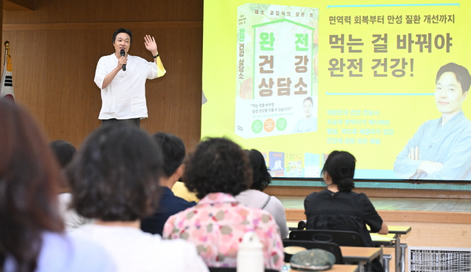 조 한약사는 한약국 상담 경험과 자신의 건강 회복 사례를 바탕으로, 약이나 건강기능식품에 의존하지 않고 식습관 개선을 통해 만성질환을 예방하고 건강을 되찾는 방법을 소개했다. 그는 “산 음식(채소와 과일)을 먹으면 살고, 죽은 음식(가공식품)을 먹으면 죽는다”며 자연식 중심의 생활 습관 실천을 강조했다. 강연에서는 연령대별 식단 추천과 구체적인 실천 방법이 제시됐다. 10대는 당근과 고구마로 성장과 시력 강화, 20·30대는 사과로 변비 예방, 40·50대는 양배추로 소화 기능 개선, 60대 이상은 바나나로 단백질과 탄수화물 보충을 권장했다. 또한 ‘cca 주스(당근·양배추·사과)’를 활용해 가족 모두가 쉽게 건강한 식단을 실천할 방법도 소개됐다. 그는 채소과일식이 단순한 건강법을 넘어 마음 수행이자 지구 환경을 지키는 길임을 강조하며 “과도한 소비와 욕심을 줄이고, 살아있는 음식을 섭취하는 것은 개인 건강뿐 아니라 기후위기 극복에도 기여한다”며 지속 가능한 삶의 중요성을 전달했다. 조승우 한약사는 한약국 ‘예방원’을 운영하며, 만성질환자들이 약을 줄이고 건강을 회복하도록 돕고 있다. 또한 『채소과일식』, 『완전배출』 등의 저자로 건강 분야에서 꾸준히 베스트셀러를 기록하며, 대중 강연과 방송을 통해 건강·행복·인생철학을 전하고 있다. 강연회에 참석한 구인모 거창군수는 “이번 아카데미를 통해 군민들이 일상에서 실천할 수 있는 건강 관리 방법과 마음의 균형을 되돌아보는 계기가 되었길 바란다”며 “앞으로도 다양한 분야의 전문가를 초청해 군민의 평생학습 기회를 확대하겠다”고 밝혔다. 한편, 남은 하반기 거창아카데미 강좌 일정은 △9월 16일(화) 19시, 정은상 창직학교 맥아더스쿨 교장 ‘ai시대, 은퇴란 없다’ △10월 21일(화) 19시, 이재철 종교인 ‘무엇을 자녀교육이라 하는가?’ △11월 18일(화) 19시, 손서락 타임뱅크 운동가 ‘서로돌봄의 공동체: 타임뱅크’가 있다. 2025년 거창아카데미 하반기 강좌는 거창군민 누구나 참여할 수 있으며, 참가 신청은 거창군 평생교육센터 누리집에서 할 수 있다.